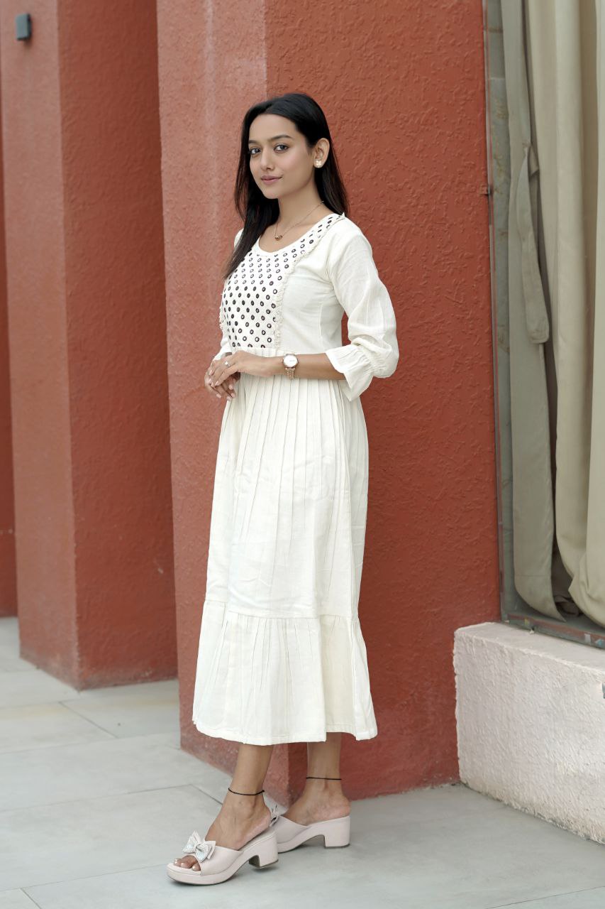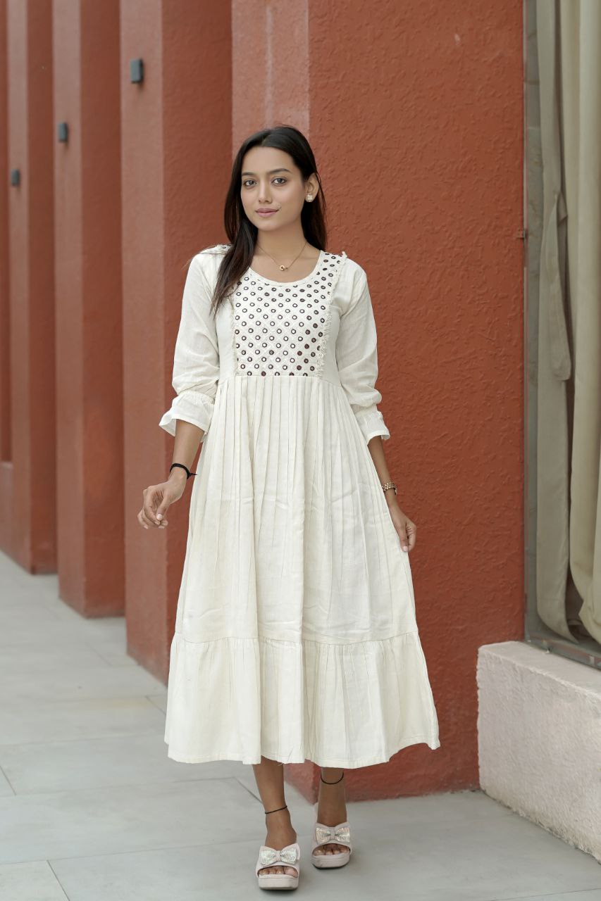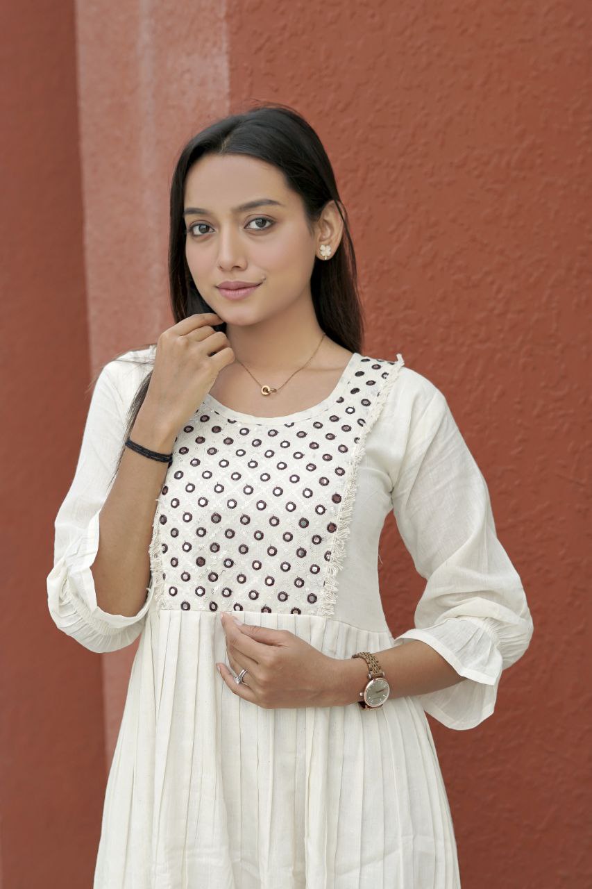 Introducing our stunning Pure Khadi Cotton Designer Kurti, launching just in time for the summer season! This exquisite piece is designed to not only provide comfort but to also add a touch of elegance to your wardrobe. The standout feature of this kurti is its beautifully crafted round shape foil mirror work, which reflects light beautifully and enhances the overall look. Whether you’re attending a casual outing or a festive gathering, this kurti is sure to make heads turn.