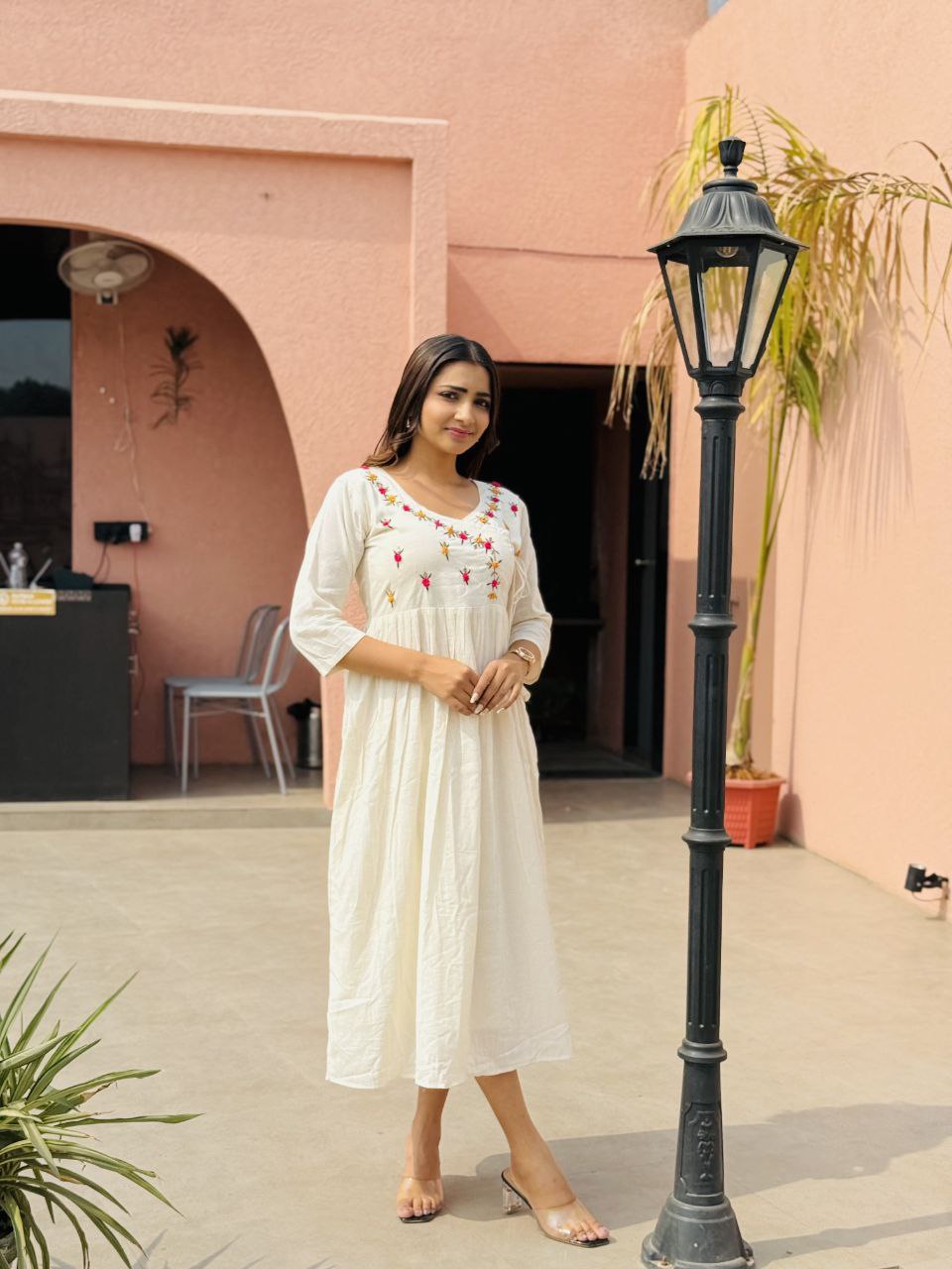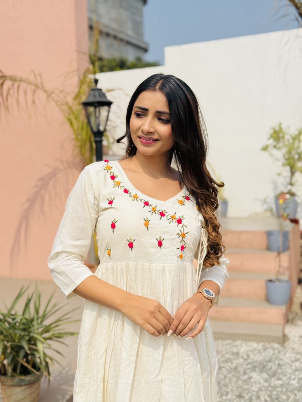 Stunning Pure Khadi Cotton Threads Work Full Flair Dress
