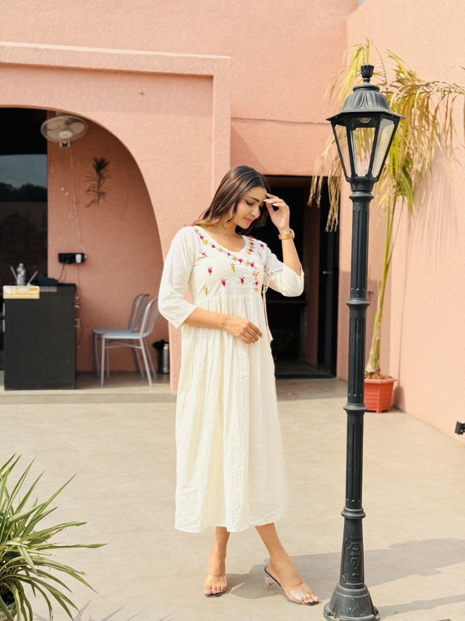 Stunning Pure Khadi Cotton Threads Work Full Flair DressStunning Pure Khadi Cotton Threads Work Full Flair Dress